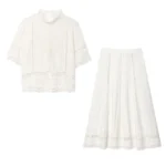 • اسم المنتج: طقم نسائي صيفي من قطعتين – قميص برقبة عالية وتنورة كروشيه