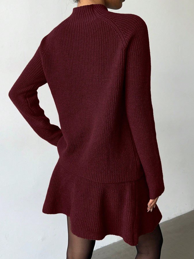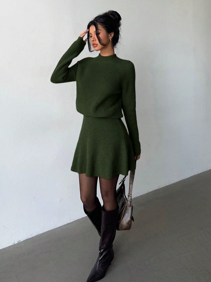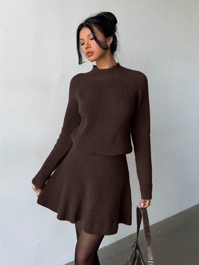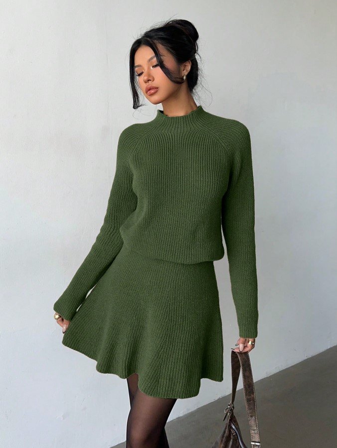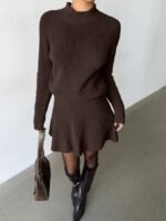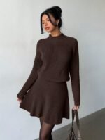 الرئيسية ملابس نسائية مجموعة قطعتين للنساء تتكون من ملابس علوية كاجوال فضفاضة بياقة مستديرة وتكسير وتنورة مطوية